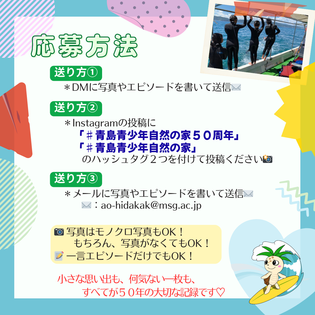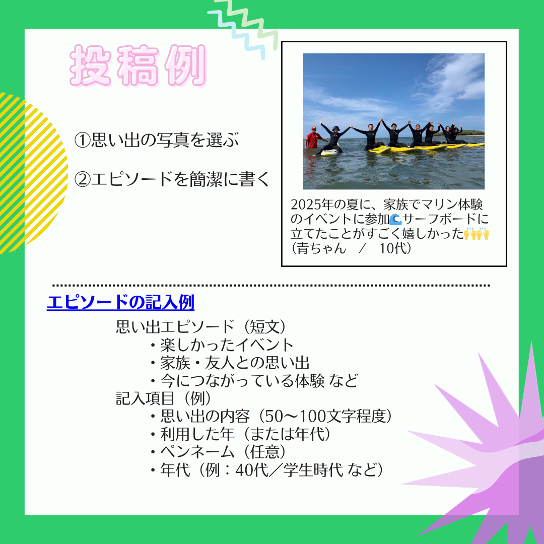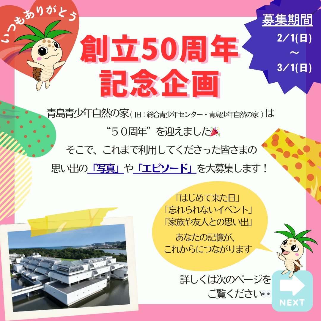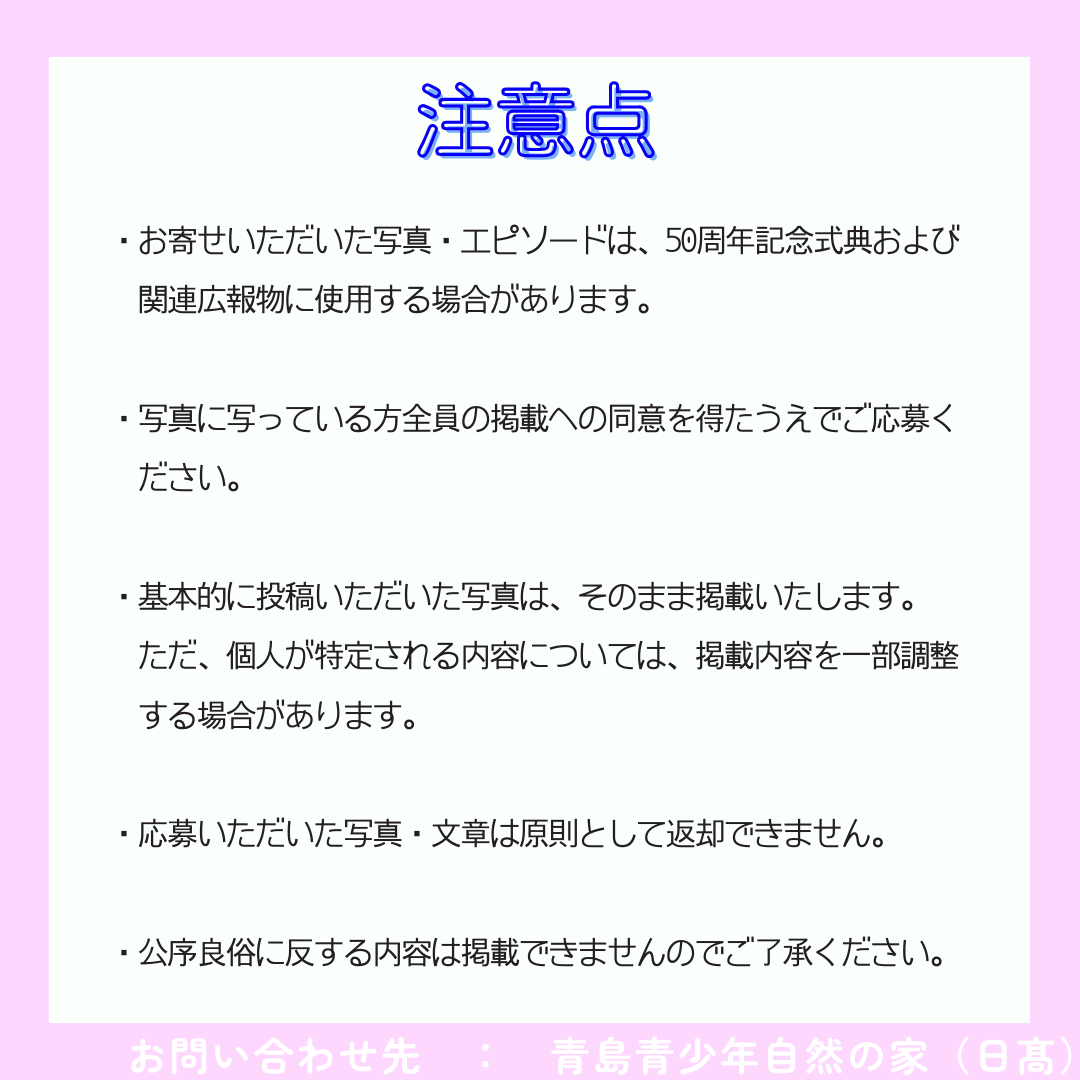 これまで当施設を利用してくださった皆さまへの感謝の気持ちを込めて、50周年記念企画として、思い出の「写真」や「エピソード」を募集します。