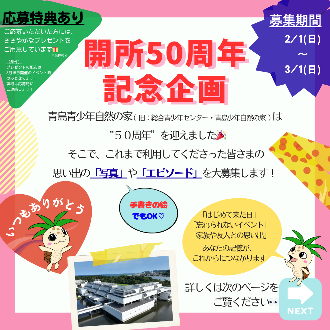 これまで当施設を利用してくださった皆さまへの感謝の気持ちを込めて、50周年記念企画として、思い出の「写真(絵もOK)」や「エピソード」を募集します。
