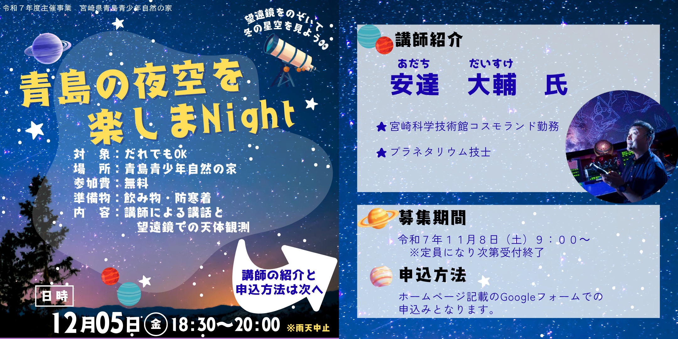 12月5日(金)18時30分~20時00分に 「青島の夜空を楽しまNight」開催いたします! 宮崎科学技術館でお仕事をされている、安達先生を講師として招き、 冬の星空に関しての講話&望遠鏡を使った天体観測会を行う予定です☆ 貴重な機会となりますので、ぜひご参加ください☺ 詳細は、コチラ お申し込みは、コチラ